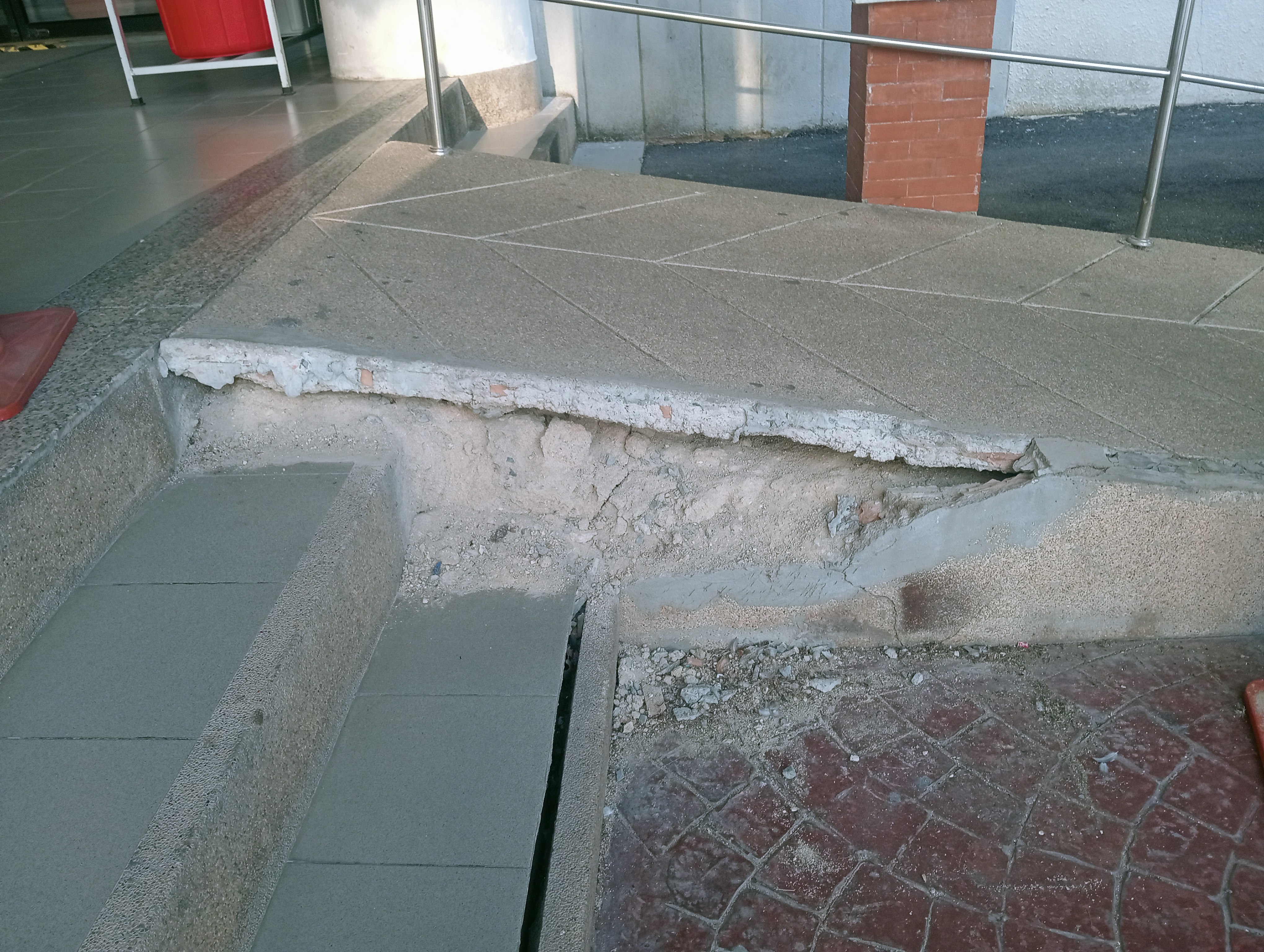 ขอบพื้นทางขึ้น-ลง ผู้พิการ คอนกรีตด้านข้างชำรุด เนื่องจากบริเวณนี้จะเป็นจุดขึ้นลงวันรับรายงานตัววันซ้อมและรับจริงของบัณฑิต |